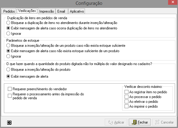 Confirmar a correta impressão do primeiro pedido: Se marcado exibe uma mensagem de confirmação na impressão do primeiro pedido marcado no formulário de impressão de pedidos de venda.