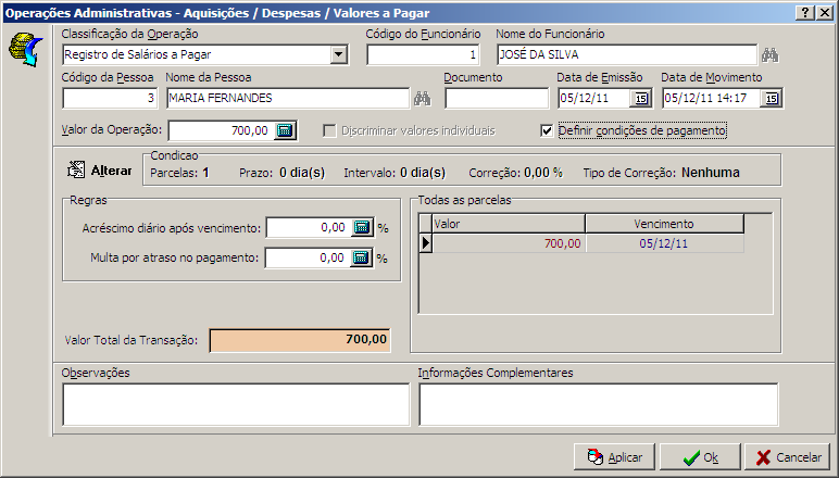 As operações de aquisições/despesas podem ser de diferentes naturezas, como, contas a pagar, salários a pagar, etc.