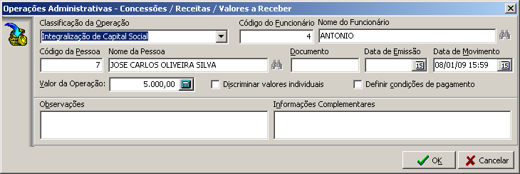 As operações de concessões/receitas podem ser de diferentes naturezas, como, captação de empréstimo, inicialização de saldo de conta, integralização de capital social, recebimento de empréstimo, contas a receber, créditos com fornecedor, etc.