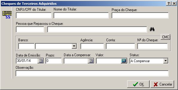 Nesta interface é possível inserir dados de um novo cheque adquirido ou alterar os dados de algum já cadastrado.