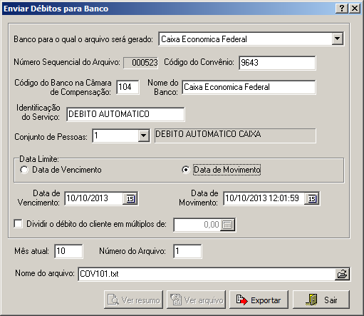 Através desta interface é possível exportar os débitos do cliente para serem cobrados via banco.