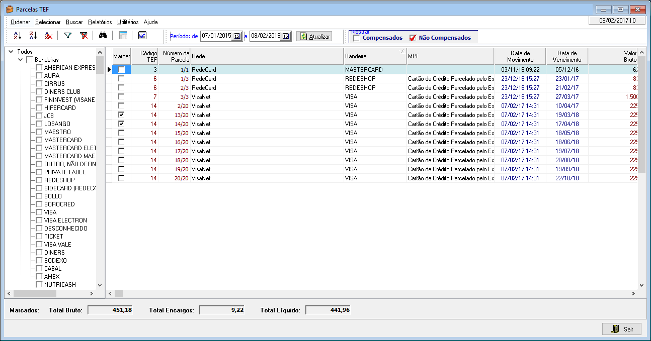 Na região esquerda da interface, existe uma lista com todas as redes e bandeiras cadastradas no sistema. Clicando duas vezes na rede ou bandeira, irá selecionar a mesma, filtrando na interface as parcelas relacionadas com as redes e bandeiras marcadas.