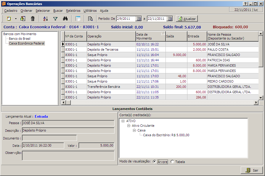 Nesta interface são feitos todos os tipos de lançamentos em contas bancárias.