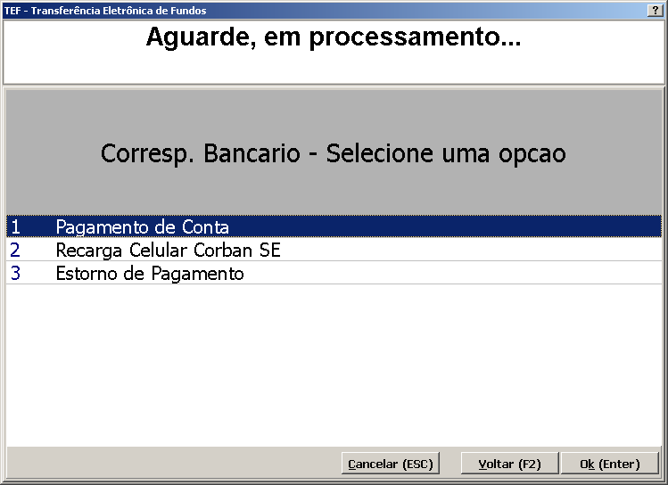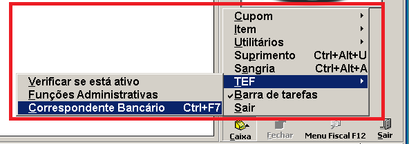 A função de Correspondente Bancário só funcionará se os parâmetros "TEF (Transferência Eletrônica de Fundos) está disponível" e o "TEF Dedicado utilizando CliSiTEF" da interface de Configuração estiverem marcados. Além disso, o CAIXA deve está exibindo a mensagem de CAIXA LIVRE.