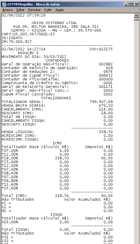 Logo abaixo está um exemplo de uma parte de um arquivo eletrônico gerado pela opção "Espelho MFD" do Menu Fiscal. Observe que a disposição das informações é idêntica a um documento emitido pelo ECF (no exemplo, Redução Z), o que possibilita a compreensão utilizando apenas um editor de texto (Bloco de Notas).