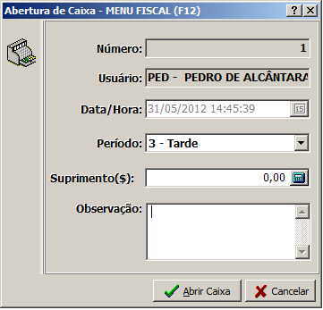 do usuário responsável pela Abertura de Caixa. Esse usuário não necessariamente é