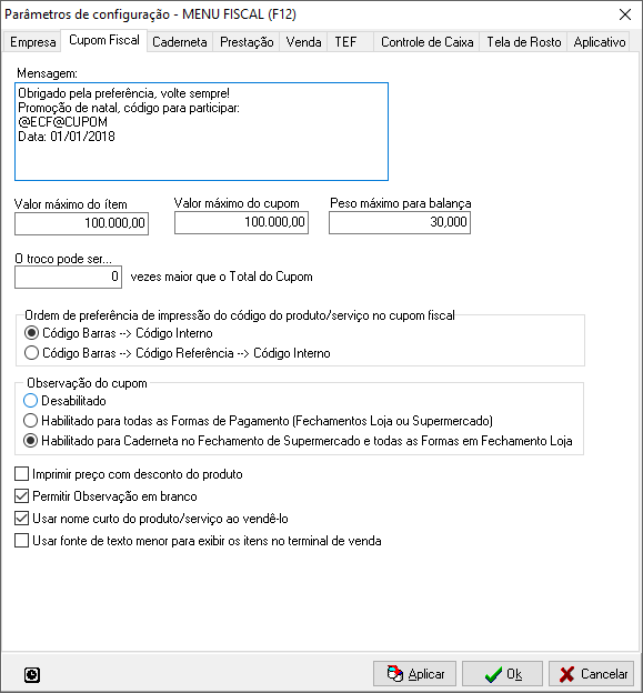 Configurações Relacionadas ao Cupom Fiscal