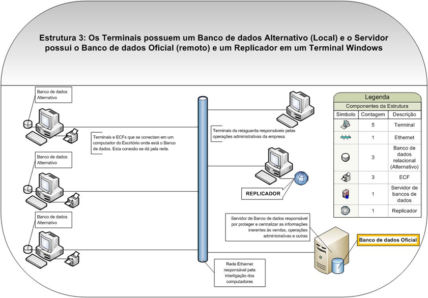 A estrutura 3 será caracterizada quando todos os terminais estiverem conectados a um Servidor de BD e os terminais de venda possuírem um BD local reservado para utilização em caso de perda de conexão com o Servidor. Em um dos terminais do escritório que possuir o Sistema Operacional Windows, estará instalado um conjunto de aplicativos denominado Replicador, responsável por replicar informações referentes aos cadastros e emissões de cupons dos BDs dos terminais de venda para o BD do Servidor e vice-versa, mantendo a compatibilidade entre os mesmos.