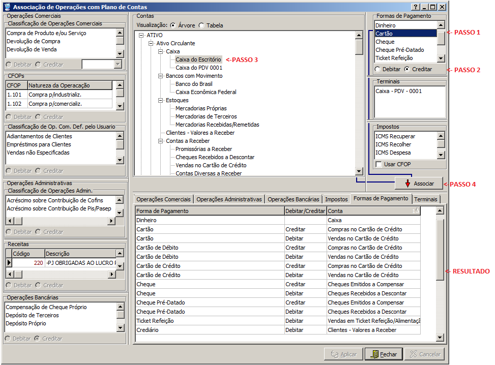 Neste exemplo, o usuário aprenderá como realizar uma Associação de Formas de Pagamento com determinada(s) conta(s) do Plano de Contas da empresa.
