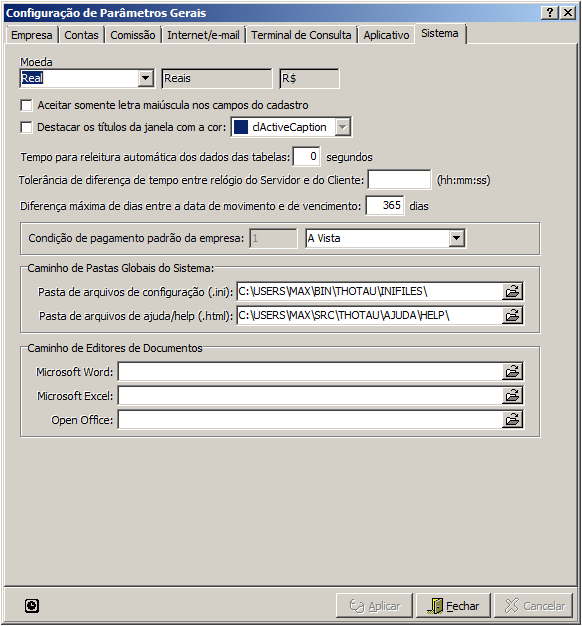 - Moeda: Caracteriza o tipo de moeda que o Sistema adotará como padrão.