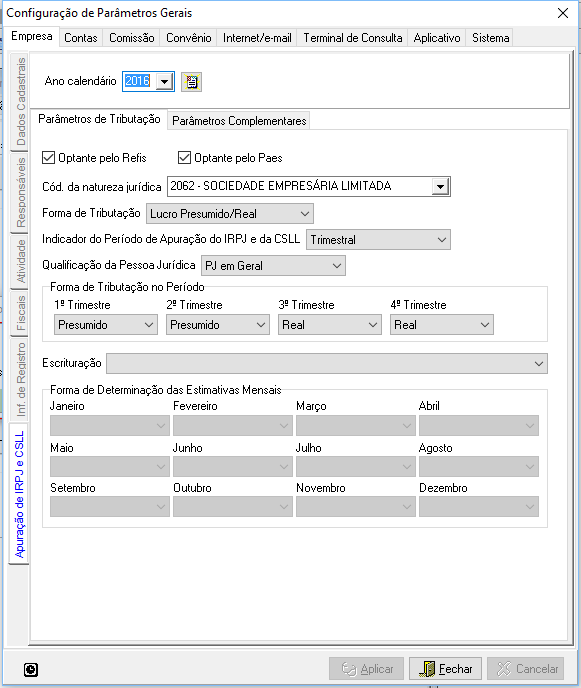 Os Parâmetros desta aba, se aplicam apenas às informações fiscais do Sistema.