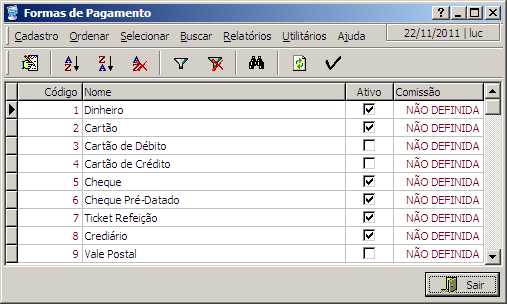 É importante não confundir formas de pagamento com condições de pagamento (“A vista”, “Duas parcelas”, “Três vezes sem entrada”, etc.). As condições de pagamento são registradas no Controle Administrativo e os campos (descrição, descontos, multas etc.) são definidos pelo administrador da empresa.
