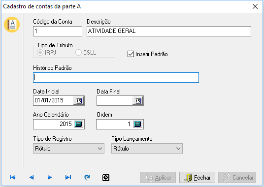Inserir Padrão: Indica se, ao gerar uma apuração, esta conta será