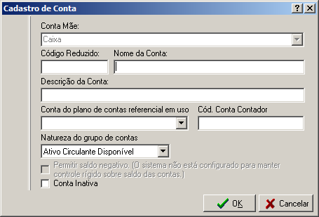 - Conta Mãe: É a conta que estava em foco ao clicar em inserir nova conta.