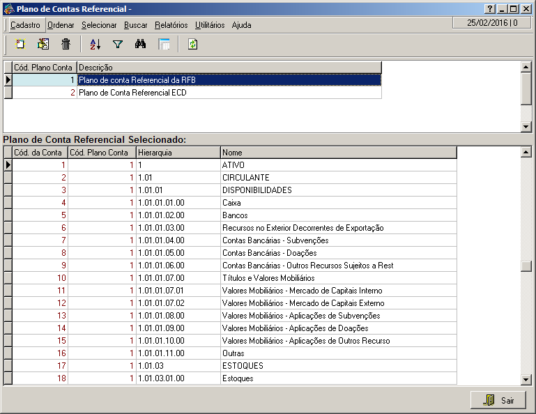 Esta interface exibe os planos de contas referenciais cadastrados no sistema.