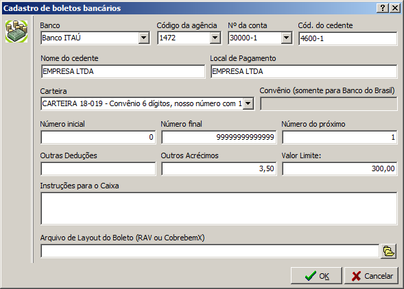 - Convênio: Será informado pelo banco no momento da contratação do serviço de boletos.