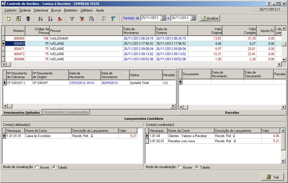 Nesta interface são exibidos os detalhes do recibo em foco, como vencimentos quitados ou compensados associados ao recibo, parcelas geradas pelo recibo e os lançamentos contábeis resultantes de sua efetivação.