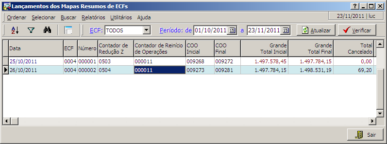 Esta interface exibe todos os lançamentos de mapas resumo de ECF realizados em um período que poderá ser informado pelo usuário. Nesta interface também é possível gerar o Relatório de Conferência de Lançamentos dos Mapas Resumos.