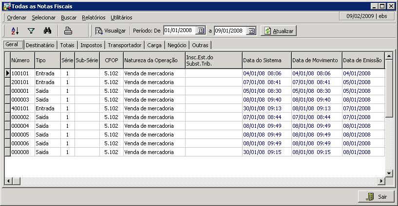 Esta interface exibe as notas fiscais cadastradas (somente visualização), com seus respectivos dados, para um dado período de tempo que o usuário poderá informar.