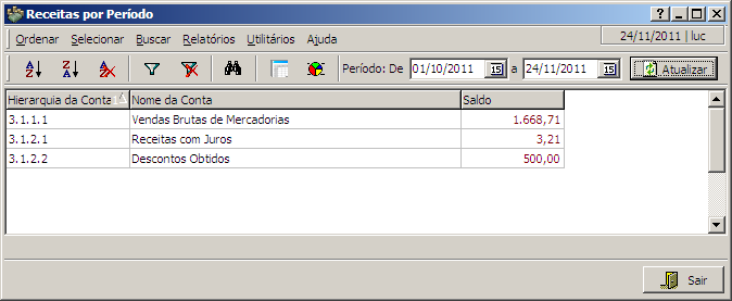 Nesta interface é possível visualizar informações referentes ao saldo de todas as contas de receitas para um determinado período.