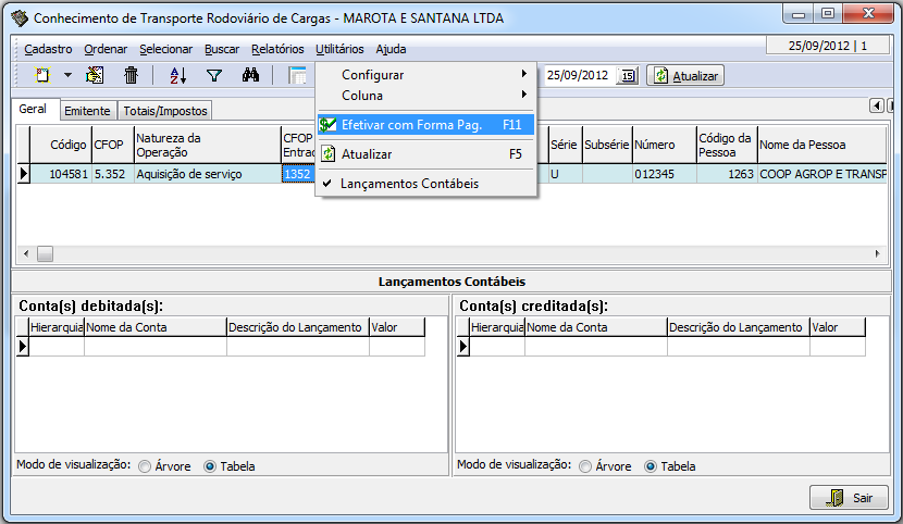 Efetivar Conhecimento de Transporte: Quando é feita a efetivação de um conhecimento de transporte de compra a vista, o sistema faz um lançamento contábil de débito numa conta de despesa e um lançamento de crédito numa conta de ativo. Se a compra for a prazo, além de fazer os lançamentos nas contas apropriadas, o sistema também vai gerar automaticamente as contas a pagar referentes à operação.