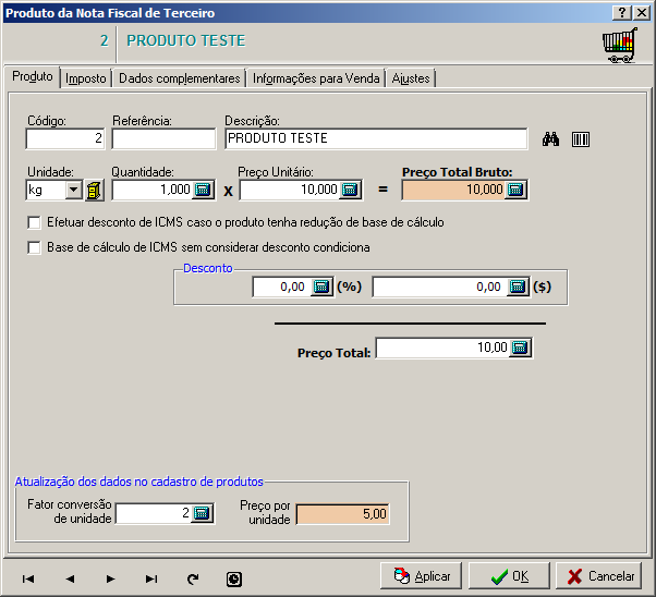 Nesta interface são registrados os dados de produtos que constam na nota fiscal de terceiro.