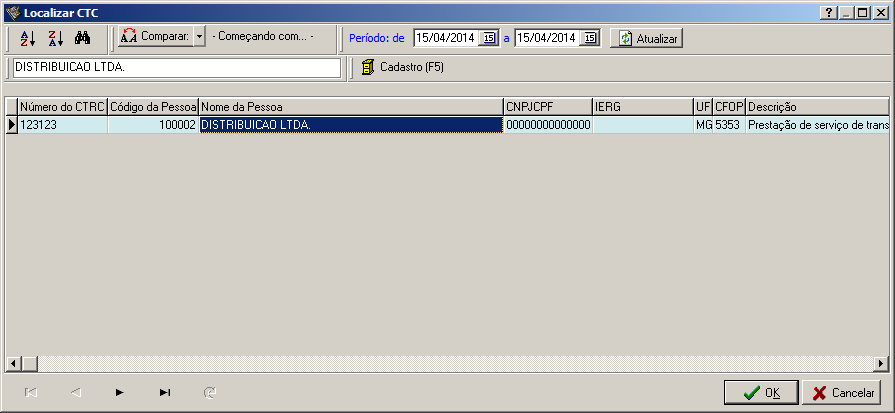Nesta interface é possível buscar um registro de CTC (Conhecimento de Transporte de Cargas) que esteja cadastrado no sistema.