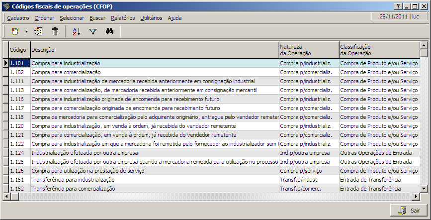 Nesta interface é possível visualizar e alterar a lista de CFOPs utilizados no sistema.