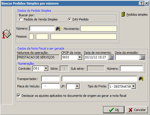 Nesta interface é possível escolher se a busca é por Pedido de Venda Simples (PVS) ou DAV-Pedido e informar o número do pedido que será usado para gerar a nota fiscal.