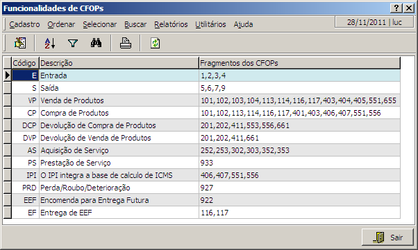 Nesta interface é possível visualizar e alterar as classificações dos CFOPs cadastrados no sistema.