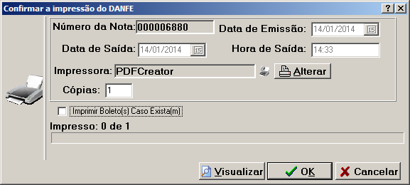 Antes de confirmar a impressão da nota fiscal é importante confirmar o número que o sistema gerou para a nota, a data de emissão e a impressora para onde os dados serão enviados. O usuário pode ter um preview da nota antes de imprimi-la clicando no botão "Visualizar".