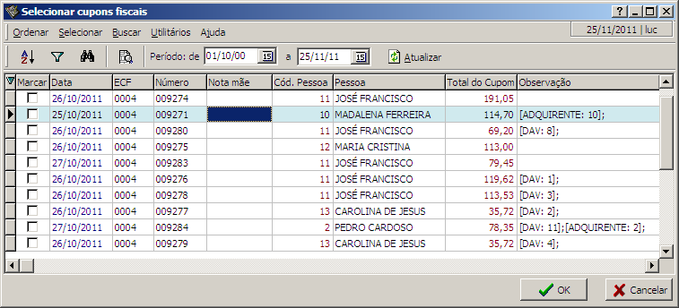 Nesta interface é possível selecionar um ou mais cupons para gerar uma nota fiscal correspondente.