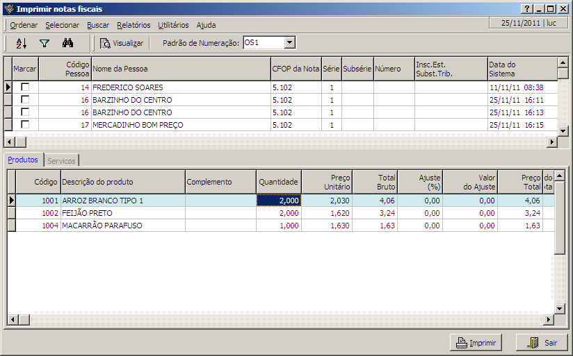Na grade superior são exibidas todas as notas fiscais que ainda não foram impressas, ao clicar sobre uma nota na grade