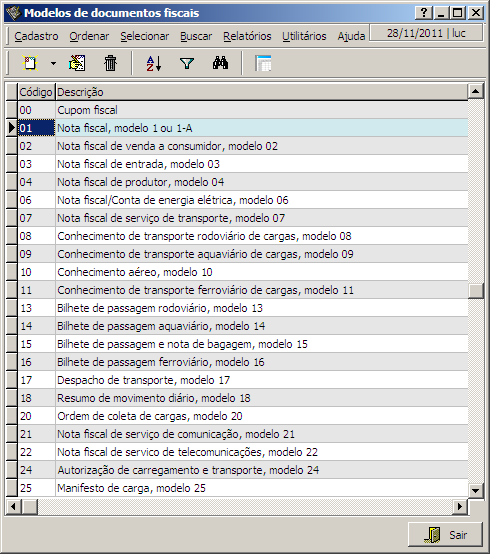 Nesta interface são cadastrados os modelos de documentos fiscais usados pelo sistema.