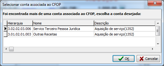 Caso o sistema identifique mais de uma associação de contas por CFOP, na interface Associação de Operações com Plano de Contas, aparecerá a seguinte interface para escolher a conta: