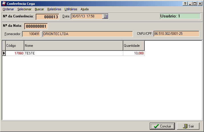 Nesta interface de Conferência Cega é permitido que o usuário registre informações das mercadorias recebidas, onde o usuário apura a quantidade das mercadorias recebidas através da Listagem de Conferência Cega sem ter conhecimento da nota fiscal ou pedido emitido. Após a apuração, informa os produtos e suas respectivas quantidades para o responsável pelo recebimento da mercadoria, que, por sua vez, insere os valores nos devidos campos para comparação com a nota fiscal. Após concluir essa etapa é necessário voltar no modulo Nota Fiscal e Aceitar ou Recusar essa Conferência Cega.