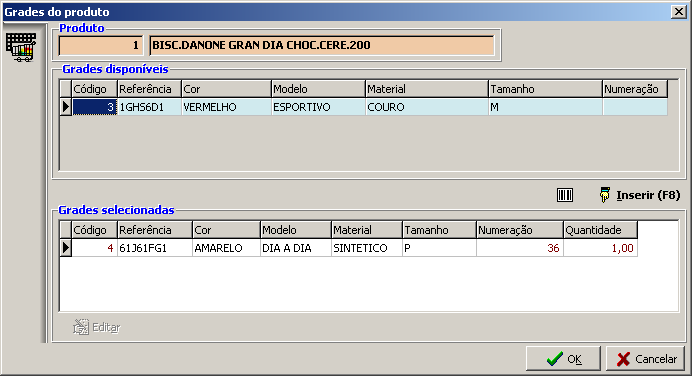 Interface de inserção de grades de um produto, caso este possua grades ativas.