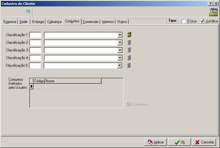 Nesta interface, teremos as opções de Classificações e Conjuntos, que poderemos usar para associar os clientes cadastrados.