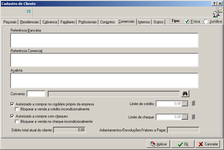 Bloquear a venda a crédito incondicionalmente: Se este campo estiver marcado, o sistema não deixará que sejam efetuadas vendas a prazo para este cliente. Esta opção é desbloqueada somente se o cliente estiver com permissão para compras no crediário.