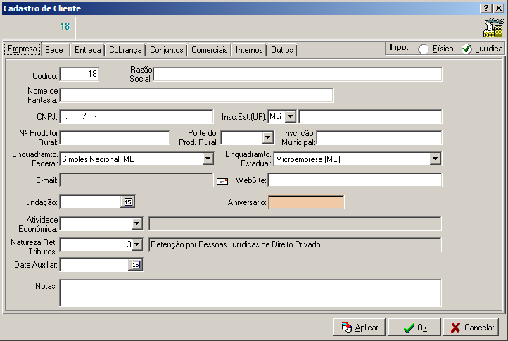 Natureza Ret. Tributos: Campo destinado a definir a Natureza de Retenção dos Tributos de acordo com o enquadramento da empresa.