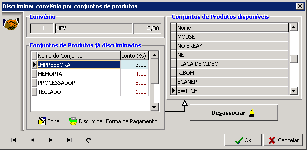 Nesta interface é possível associar conjuntos de produtos ao convênio selecionado variando o percentual de desconto para mais ou para menos.