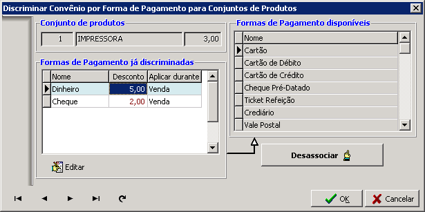 Nesta interface é possível associar formas de pagamento ao conjunto de produtos associado ao convênio selecionado variando o percentual de desconto para mais ou para menos.