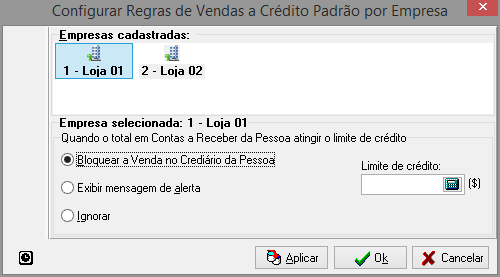 Nessa interface deverá ser definido qual o padrão de checagem de venda a crédito para cada empresa. Todas devem receber uma configuração.
