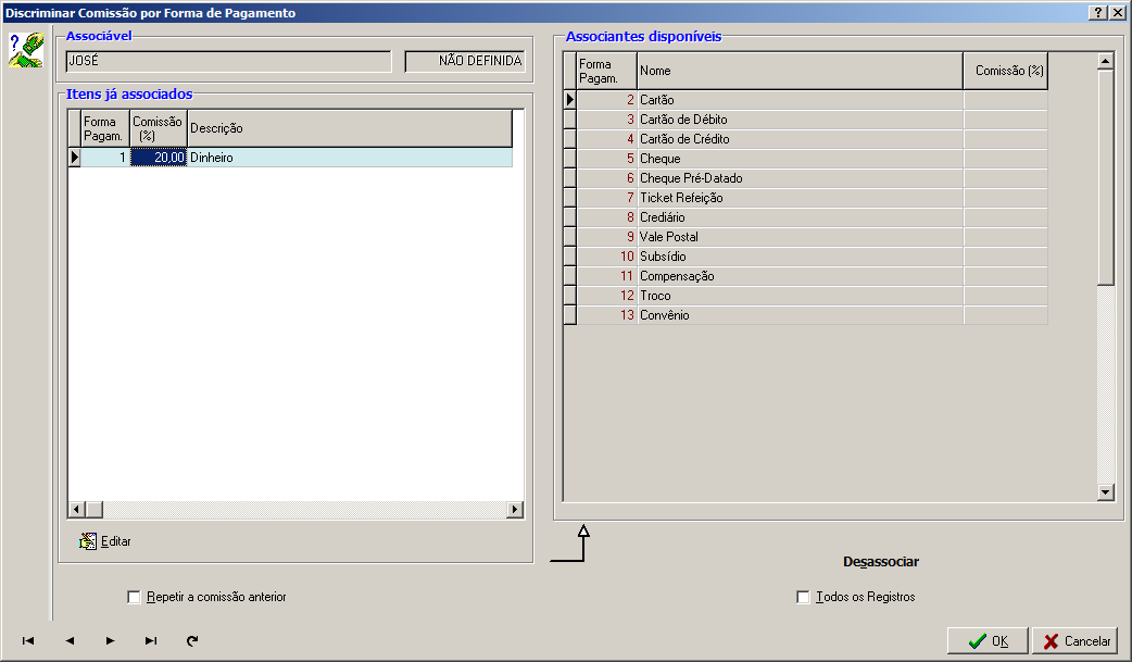 Nesta interface o usuário poderá associar Condição de Pagamento aos colaboradores e discriminar a comissão que será paga para cada Condição de Pagamento efetuada no fechamento das transações comerciais, para este colaborador.