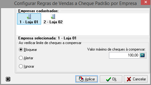 Nessa interface deverá ser definido qual o padrão de checagem de venda a cheque para cada empresa. Todas as empresas devem receber uma configuração.