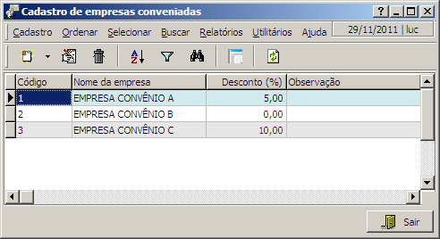 Nesta interface são feitos os cadastros dos convênios da empresa, onde é definido o percentual de desconto a ser dado nas vendas para clientes que pertencem ao convênio.