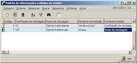 Nesta interface são cadastradas informações padrão que serão vinculadas aos clientes para que sejam exibidas para o funcionário durante a realização de vendas para clientes.
