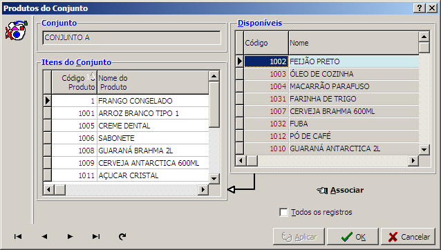 Nesta interface o usuário fará as associações dos produtos aos conjuntos. Basta escolher o produto na lista de produtos disponíveis e clicar no botão Associar.