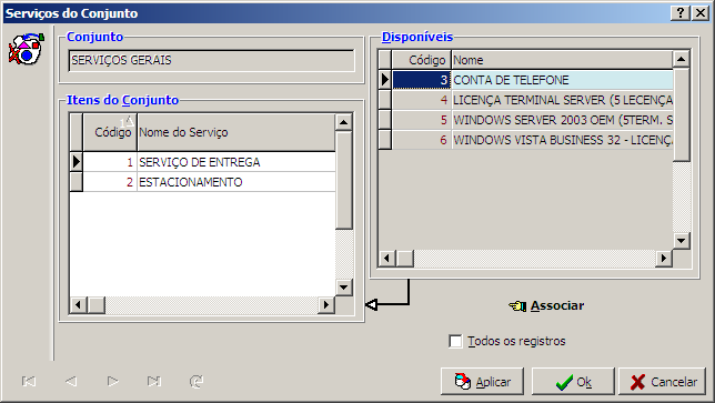 Nesta interface o usuário terá acesso às associações de serviços aos conjuntos.