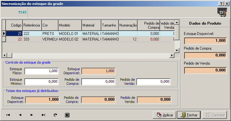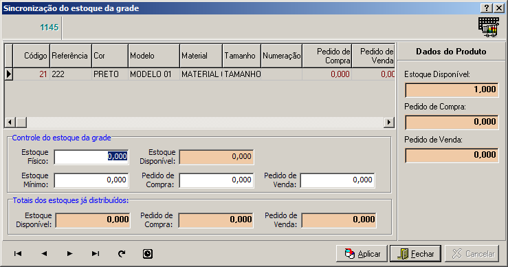 Interface de sincronização de estoques das grades de um produto. Será utilizada para casos de cadastro de grades para produtos que já possuam movimentações de estoque, ou então, um produto que seja controlado por grades e que tenha suas grades desativas por um certo período que necessita voltar a ser controlado por grade, então será necessário sincronizar as informações sobre estoques.